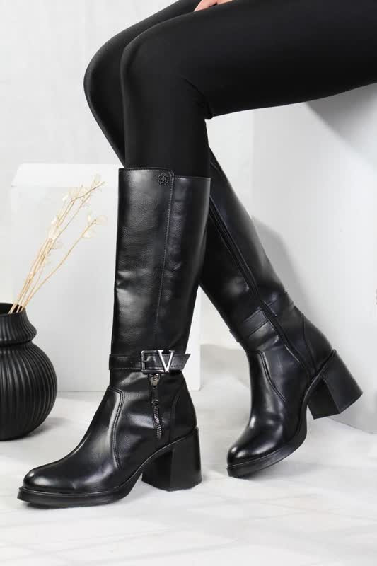 بخش ساق بوت با دوخت دقیق و درزهای مهندسیشده تا زیر زانو امتداد یافته و به کمک زیپ فلزی مقاوم در کنار ساق، پوشش و تعویض سریع را ممکن میسازد. همچنین بند چرمی تزئینی با سگک فلزی V شکل جلوهای مینیمال و ظریف به طراحی افزوده و برای استایلهای رسمی، نیمهرسمی و روزمره گزینهای ایدهآل محسوب میشود.